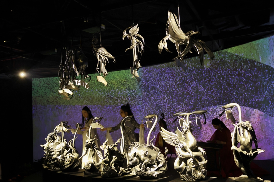 名为“万籁寂”的陨石编磬装置也引人关注。这套乐器由20片精研陨铁切片锻造而成,安装在20个中国古代神兽的脊背上。从外观看,与其说是一套编钟,更像一组精美的神兽雕塑。敲击陨石编磬,其声效时而铿锵,时而绵长。“万籁寂”演奏每半小时播放一次,每次约三分钟,让参观者聆听来自宇宙的乐音。