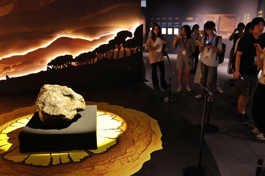 陨石文化展的一件重要展品是还原《西游记》记载、按原著描述打造的“纯陨铁金箍棒”。这根重13500克的“金箍棒”由棕色铁陨石制成,呈现陨铁独有的金属质地。棒身采用苏州云纹精雕工艺,与维斯台登纹(一种存在于铁陨石中的特殊纹理)相得益彰,尽显神器撼世锋芒。